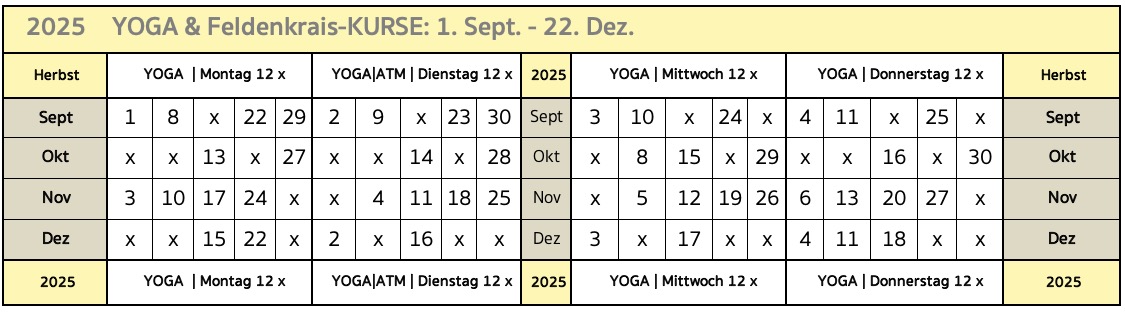 Es gibt mich als Trainerin in offenen Gruppen für YOGA und die Feldenkrais Methode in echt und auch online. Der Herbst 2025 auf der Matte beginnt mit Montag, 1. September.