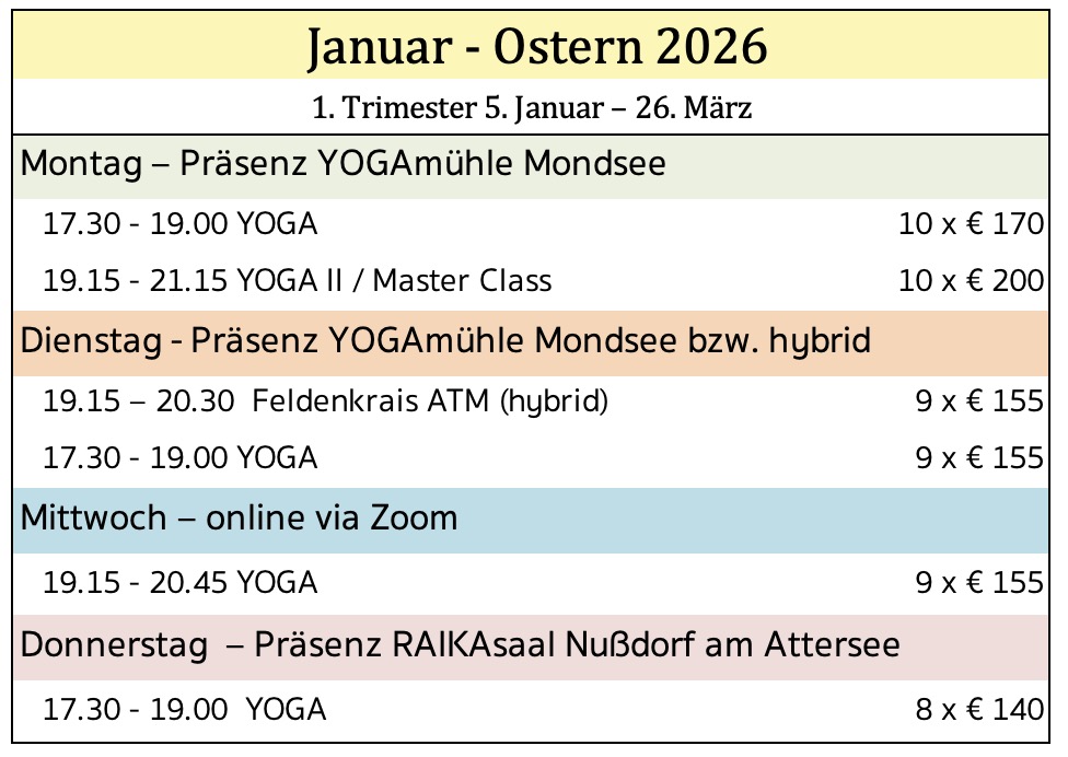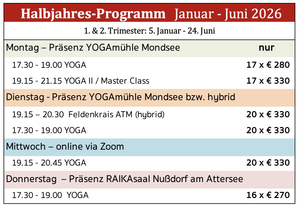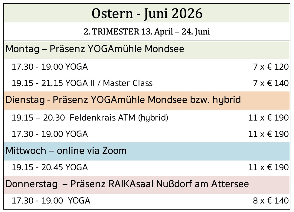 Generell werden versäumte Kurseinheiten nach kurzfristiger Rücksprache in anderen Kursen bzw. in den online-Terminen nachgeholt – eigenverantwortlich und nur innerhalb der jeweiligen Kursperiode (z.B. Sept - Dez.). Dabei darf gemischt werden z.B. YOGA Kurse mit Feldenkrais ATMs und umgekehrt. Das gilt auch für die TeilnehmerInnen am YOGAkurs in Nußdorf am Attersee - nachholen in Mondsee oder virtuell.